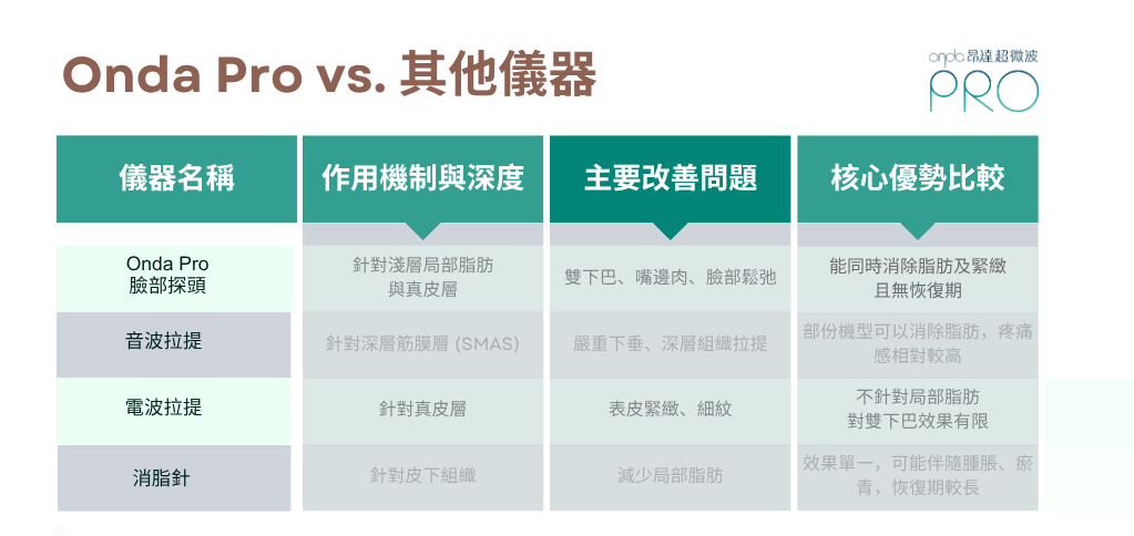 Onda Pro 專注於「輪廓線」與「多餘體積」的黃金組合,為雙下巴醫美推薦提供了更全面且舒適的選擇。