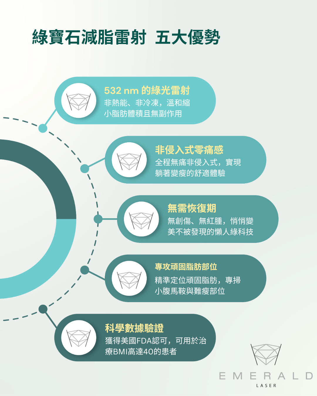 綠寶石雷射具備五大優勢:無侵入性治療、無須打針或麻醉、無紅腫或瘀青、無副作用且無恢復期 。對於現代忙碌族群而言,讓使用者在不改變工作與社交節奏的前提下,輕鬆達成局部塑形或全身減重的目標 。