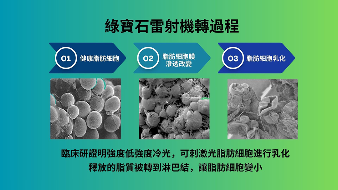 它利用特定波長的低強度雷射作用於肥大的脂肪細胞,使其內容物(脂質)乳化並釋放至細胞間隙,隨後透過人體自然的淋巴系統代謝排出 。