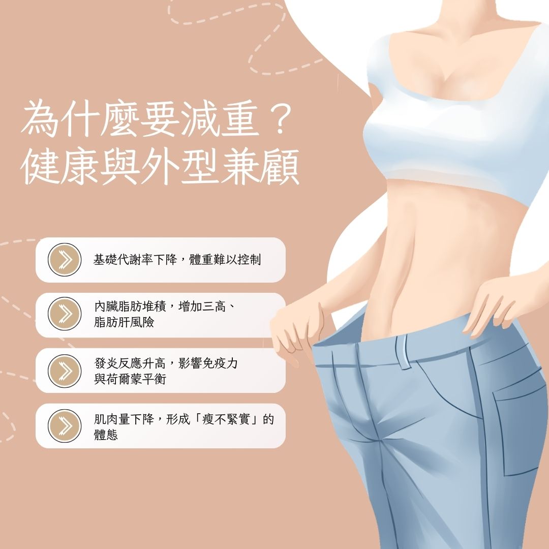 減重的目的不僅僅是外表的美觀,更重要的是健康管理。隨著體脂率的上升,身體會面臨多方面的負擔,例如基礎代謝率下降,導致體重難以控制;內臟脂肪增加,可能引發三高、脂肪肝等健康風險;發炎反應升高,影響免疫力與荷爾蒙平衡;肌肉量下降,形成瘦但不緊實的體態。換句話說,減重的核心應該是降低脂肪比例、提升代謝效率,而非單純的節食或追求體重數字的下降。
