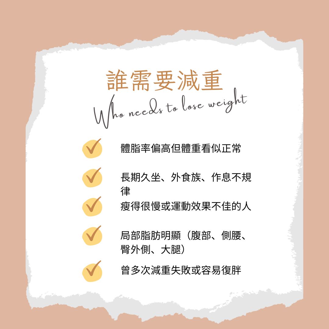 並非所有想瘦的人都適合同一種減重方法。以下幾類族群尤其適合進行系統化、科學化的減重計畫。首先,體脂率偏高但體重看似正常的人,由於脂肪集中在腹部或腰臀,容易形成「隱性肥胖」,這類人即便體重不高,健康風險仍不容忽視。其次,久坐、外食、作息不規律的人群,長期缺乏運動和營養均衡,很容易形成代謝下降、脂肪堆積的問題。第三類是那些運動效果差、瘦得很慢或曾多次減重失敗的人,他們的脂肪細胞對代謝信號不敏感,需要透過專業方法刺激脂肪動員。最後,局部脂肪明顯的人群,如腹部、側腰、臀外側及大腿,單靠運動或節食難以改善外型曲線,這時候局部雕塑療程便成為必要手段。