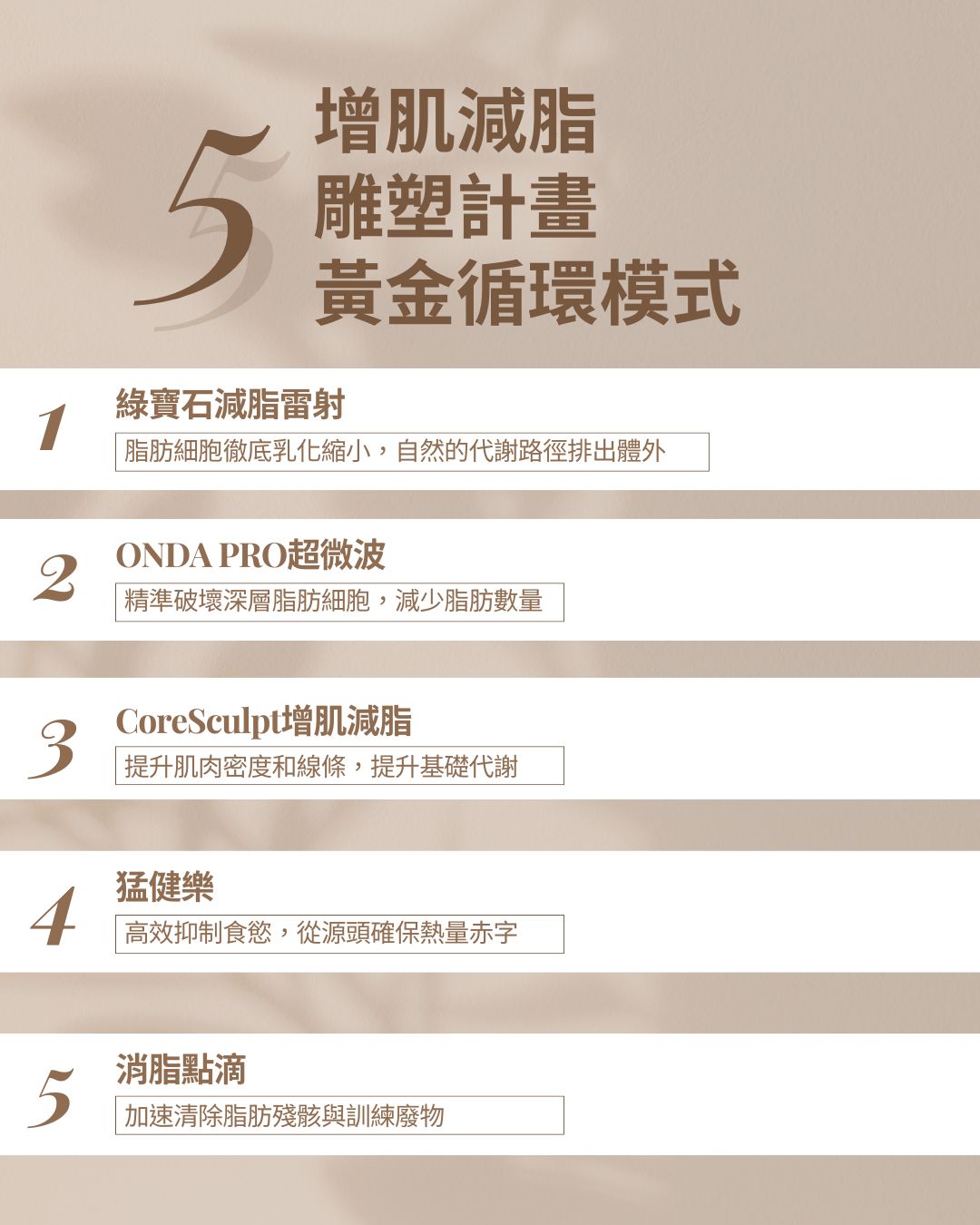 有效的減重不是靠意志力,也不是單一療程的堆疊,而是策略性、科學化的整合。透過營養師飲控、猛健樂、ONDA PRO、綠寶石減脂雷射、消脂點滴、核心肌塑等療程的協作,能有效改善體脂、提升代謝與線條美感,並降低復胖風險。對於曾多次減重失敗或想快速改善體態的人,這套方案提供了可操作、可衡量的科學策略,是通往健康與美型兼顧的理想選擇。